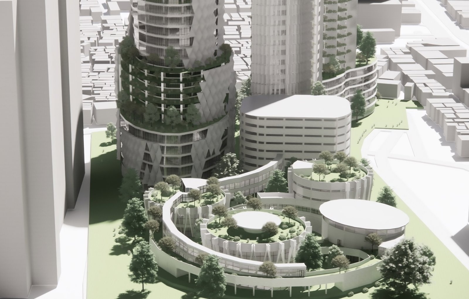 Rancangan arsitektural ini mengedepankan pendekatan pedestrian-orienteddevelopment yang berpadu dengan prinsip TOD (Transit Oriented Development), merespons lokasi strategis di kawasan Duta Merlin, Jakarta Pusat, yang terintegrasi langsung dengan akses MRT dan halte Harmoni. Perencanaan tapak dirancang untuk memprioritaskan kenyamanan pejalan kaki melalui penciptaan ruang terbuka hijau, jalur pedestrian yang aman, serta zona interaksi publik yang berfungsi sebagai pusat urban entertainment. Komposisi fungsi bangunan mixed-use yang mencakup perkantoran, hunian vertikal, dan area retail disusun secara sinergis untuk menjawab kebutuhan masyarakat urban di kawasan padat penduduk yang belum sepenuhnya didukung oleh fasilitas rekreasi dan ruang publik yang representatif.